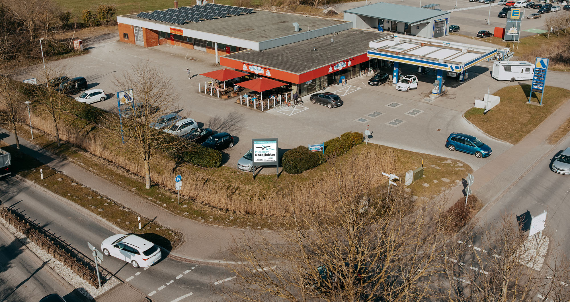 Kreisverkehr nähe EdekaMarkt, Tankstelle, Bäckerei, div. Gewerbebetriebe.